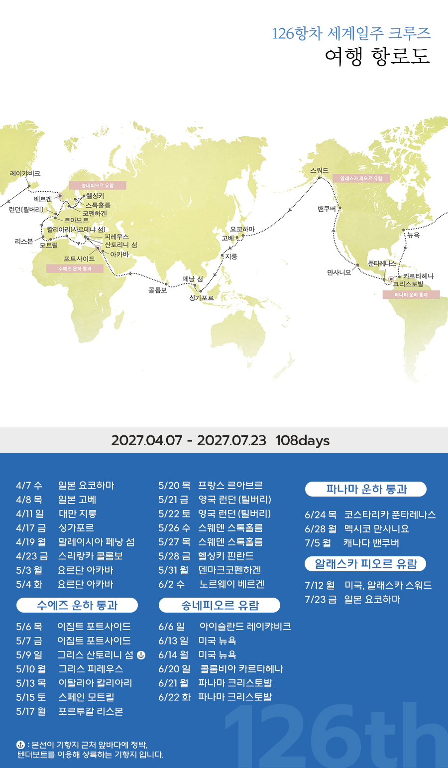 - 날씨 및 현지 기항지 등의 사정에 따라 입출항일이 변경될 수 있습니다.