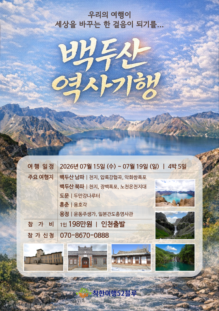 한민족의 영혼이 깃든 백두산을 눈에 담고, 독립운동의 의지를 마음으로 느끼는 여행, 함께합시다✈️