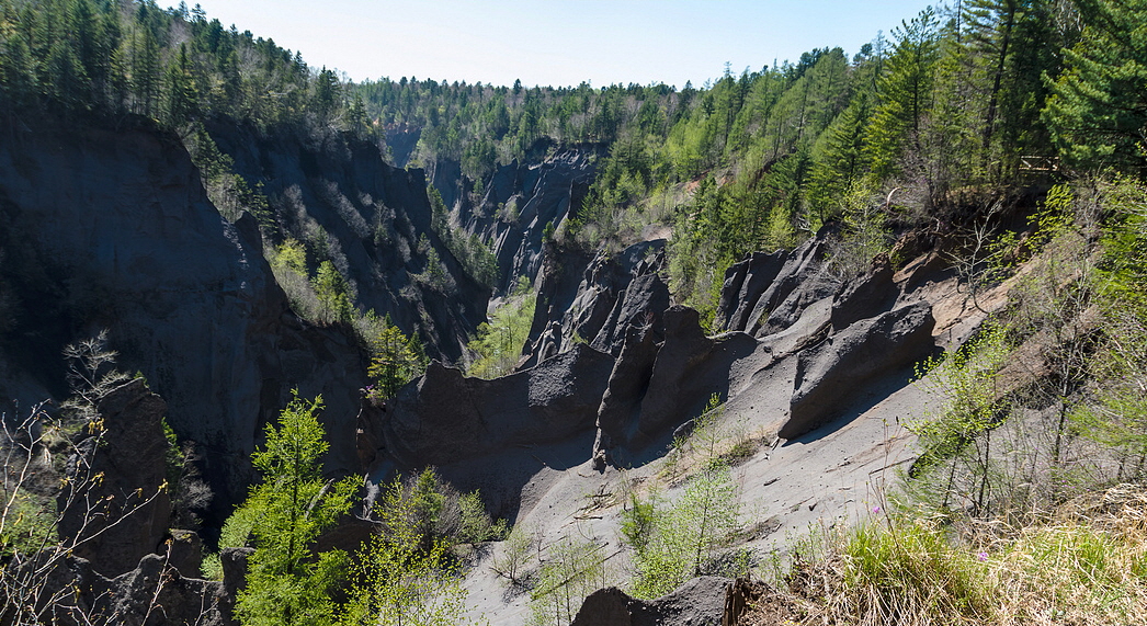 천지의 용암이 분출할 때 용암이 흘러내린 자리로 V자 모양인 천길 낭떠러지 사이로 에메랄드 빛 계곡수가 유유히 흐릅니다. 기묘한 형태의 바위들이 용암을 분출한 시기 이후로 그대로 멈추었고 지금은 그 주위가 천혜의 원시삼림을 이루었습니다. 자연 그대로의 모습을 뽐내는 북파의 "금강대협곡" 입니다.